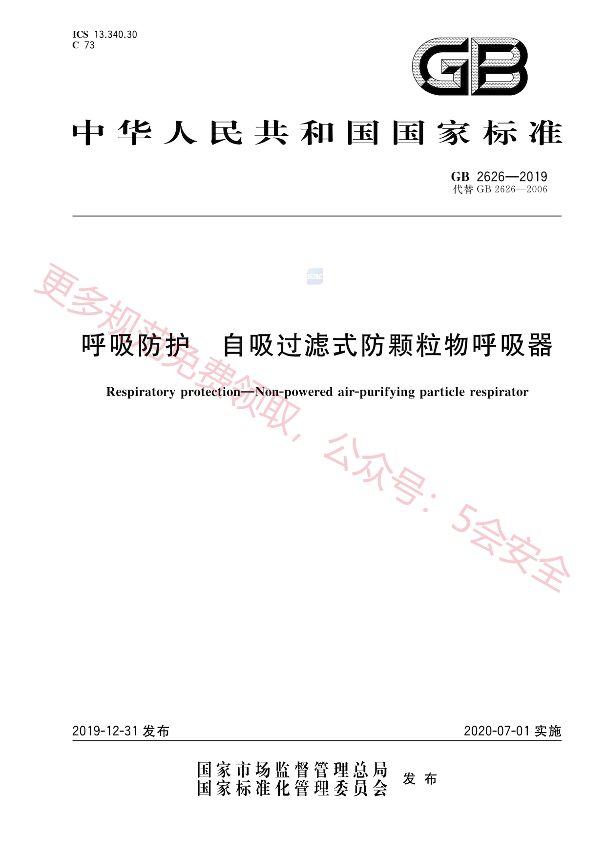 GB2626-2019呼吸防护自吸过滤式防颗粒物呼吸器