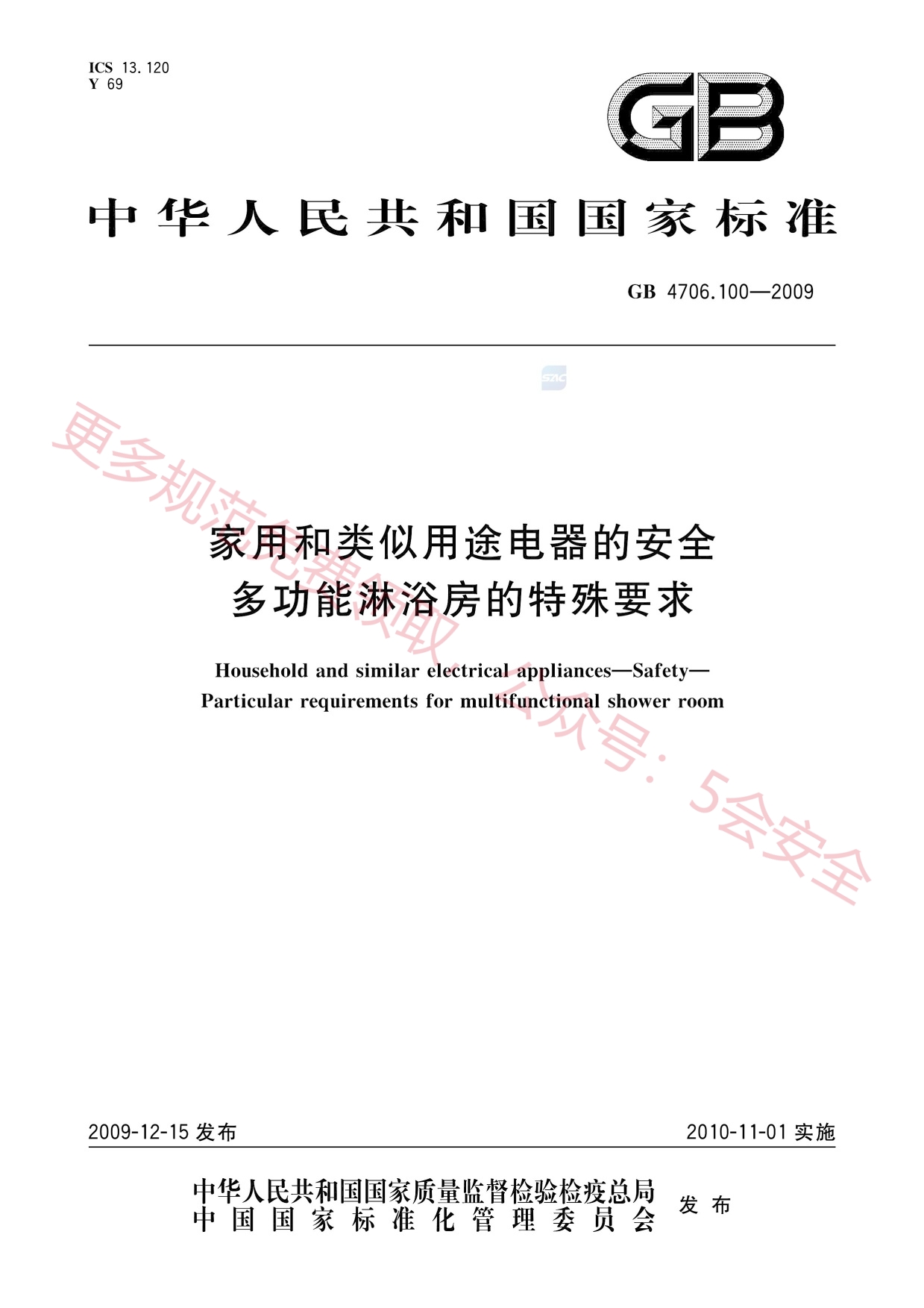 GB4706.100-2009家用和类似用途电器的安全多功能淋浴房的特殊要求